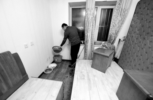 記者來到五樓漏水的居民家中,在他們家漏水的房間內(nèi),地板依然浸泡在水中。