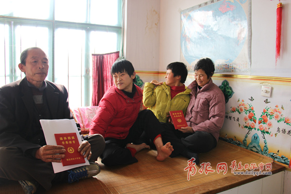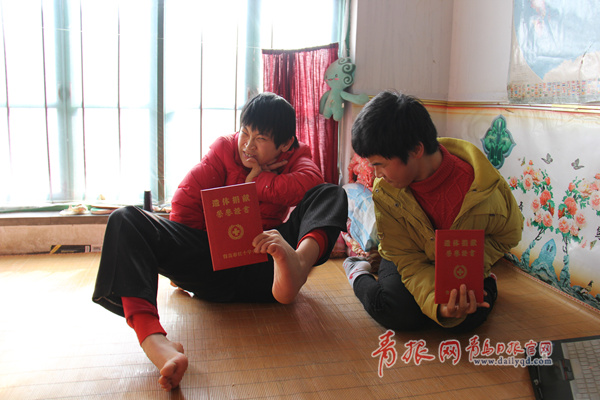 ????登記手續(xù)辦好后,一家四口高高興興的拿著證書合影留念??吹焦ぷ魅藛T舉起相機(jī),姐姐用腳趾、妹妹用手指分別夾起捐獻(xiàn)證書、高高舉起照相留念,口齒不清的姐妹倆多次艱難的說著兩個字,母親在旁翻譯說“她倆說的是高興、高興”。