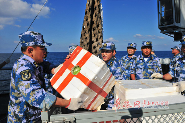 ????正午時分,這批重達28噸的慰問品全部轉運完畢,官兵和船員們在船舷邊揮手道別。航跡道道,寫下了被護商船和護航官兵真誠熾熱的魚水深情;浪花朵朵,見證了祖國人民和子弟兵之間永遠割不斷的血脈相連。