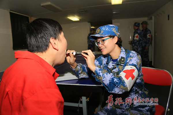 微山湖艦醫(yī)療小分隊為新赤灣輪船員進行醫(yī)療服務。張明星攝