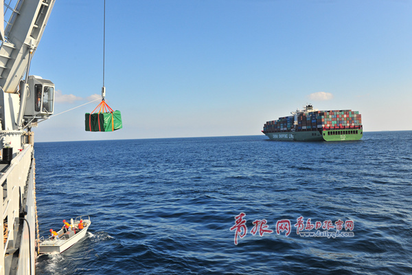 “新赤灣”輪2月2日抵達亞丁灣西部海域,慰問海軍第十九批護航編隊。圖為精心指揮與新赤灣輪會合。熊利兵攝