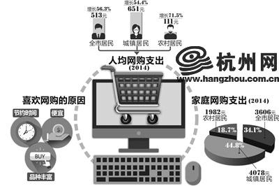 ????國家統(tǒng)計(jì)局杭州調(diào)查隊(duì)有一項(xiàng)最新的抽樣調(diào)查:2014年杭州全市居民,人均通過互聯(lián)網(wǎng)購買的商品或服務(wù)支出為513元,比上年增長56.3%。抽樣調(diào)查的居民家庭中,有網(wǎng)購支出的家庭占三成以上,戶均支出3606元。