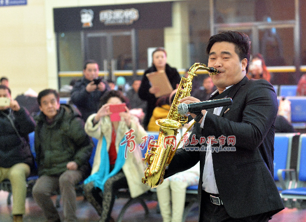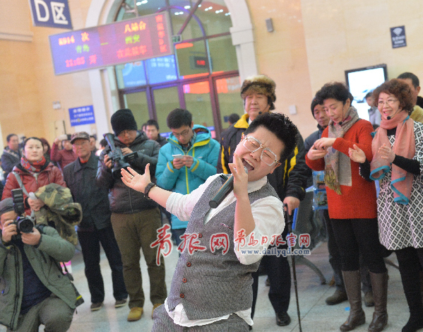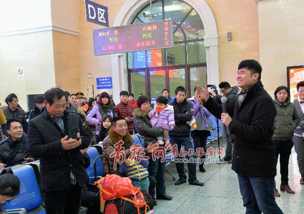 ??? 由市南區(qū)文化新聞出版局、青島火車站、青島市群眾藝術(shù)館聯(lián)合主辦,市南區(qū)文化館、青島市朗誦藝術(shù)家協(xié)會(huì)承辦的“文化進(jìn)車站春運(yùn)歡樂(lè)行”公益微演活動(dòng),春運(yùn)第一天2月4日上午9:30分走進(jìn)青島火車站,市南區(qū)優(yōu)秀藝術(shù)人才為島城市民、返鄉(xiāng)旅客呈現(xiàn)經(jīng)典文藝節(jié)目,以“不期而遇”的形式,送上新春的祝福。周光輝攝