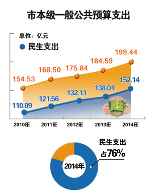 ????去年花出去的錢,很大一部分都是用在了民生上,市本級一般公共預(yù)算用于民生方面的支出152.14億元,同比增長10.2%,占一般公共預(yù)算支出的76.3%,比上年提高了1.5個(gè)百分點(diǎn),繼續(xù)確保了新增財(cái)力的2/3以上用于民生。