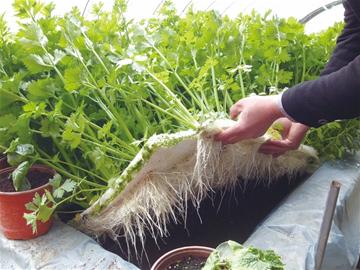 ????和一般的大棚蔬菜不同,這些蔬菜并不是扎根在泥土上,而是在一個(gè)個(gè)布滿苔蘚的泡沫板上,掀開(kāi)泡沫板,那些遠(yuǎn)遠(yuǎn)看去就似長(zhǎng)方體的“田壟”也露出了真面目,這根本就不是什么田壟,而是一個(gè)個(gè)的水池,池水深約30厘米,清澈見(jiàn)底。和清澈的池水呼應(yīng)的是泡沫底下蔬菜潔白的根須。這個(gè)占地10畝的大棚,其所栽種的這些郁郁蔥蔥的蔬菜,竟然全都是扎根水池,長(zhǎng)在水里。