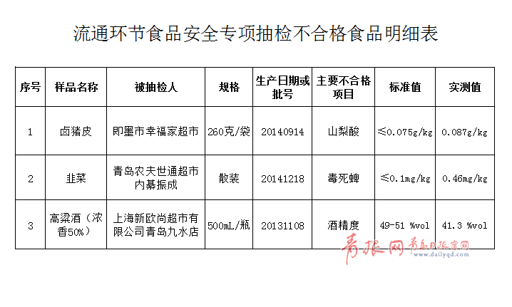 ????為保障春節(jié)期間食品質(zhì)量安全,保證市民過一個歡樂祥和的節(jié)日,日前,市食品藥品監(jiān)管局組織開展了流通環(huán)節(jié)食品安全專項(xiàng)抽檢工作。本次共抽檢食品200批次,覆蓋市南、市北、李滄、城陽和即墨五個區(qū)市,以節(jié)日消費(fèi)量較大的糧油制品、肉制品、干果、酒類、生鮮肉、水產(chǎn)品等6大類食品為主要抽檢品種,分別從商場超市、專業(yè)批發(fā)市場、集貿(mào)市場、專賣店、食雜店等節(jié)日食品消費(fèi)比較集中的經(jīng)營場所抽取樣品。抽檢結(jié)果顯示,合格197批次,不合格3批次,總合格率98.5%。