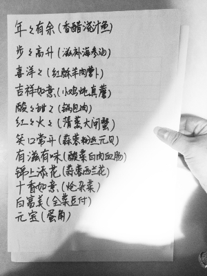 ????在這張菜單上,每道菜都起了一個好聽的名字,如“步步高升”“年年有余”“笑口常開”等?!凹热皇亲瞿暌癸?,名字和食材搭配上圖個吉利,顧客肯定會更滿意?!毕南壬f,此外他還發(fā)現(xiàn),由于今年是羊年,在他所設(shè)計的菜單里,很多顧客都會首先敲定“喜洋洋”這道菜,也就是紅酥羊肉蘿卜。