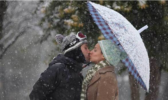 ??? 當(dāng)?shù)貢r(shí)間2015年1月9日,以色列耶路撒冷,耶路撒冷迎來(lái)2015年第一場(chǎng)雪,情侶在大雪中親吻。