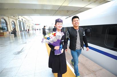 ????昨天上午7時30分許,這趟列車的旅客們陸續(xù)開始進站。隨著人群大步向前的還有蘇海麗的男友李新超,手捧鮮花進入車廂后,看到蘇海麗正在與一位旅客交談,他便耐心地等候在車廂的玻璃門外,溫柔地注視著她。在與記者交流時,李新超難掩興奮和緊張之情,一向說話流利的他變得磕磕絆絆,“我真是從來沒想過會在這么多人面前向她求婚,昨天晚上我激動得睡不著覺,在腦子里一遍遍預(yù)演,希望能好好表現(xiàn),讓她高興。 ”