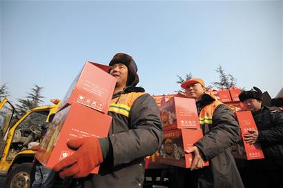 2月14日上午9時(shí)許,四輛滿載春節(jié)饅頭的貨車駛?cè)刖迓飞系睦顪姝h(huán)衛(wèi)總公司,數(shù)十名環(huán)衛(wèi)工人立即迎了上去。將饅頭卸車之后,天路公司的工作人員向在場(chǎng)環(huán)衛(wèi)工人分發(fā)了這些過(guò)節(jié)饅頭。