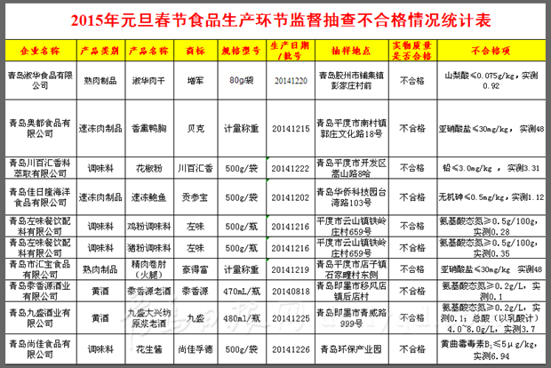 ????青島日報(bào)/青報(bào)網(wǎng)訊 日前,市食品藥品監(jiān)管局組織對元旦春節(jié)期間食品生產(chǎn)環(huán)節(jié)消費(fèi)量大的肉制品、酒類、糧食制品、調(diào)味品、炒貨及堅(jiān)果制品等重點(diǎn)食品進(jìn)行了專項(xiàng)監(jiān)督抽查,共計(jì)抽檢368批次,不合格10批次,合格率為97.3%。抽檢不合格食品主要為肉制品、酒類、糧食制品、調(diào)味品、炒貨及堅(jiān)果制品等,不合格項(xiàng)目主要是山梨酸、亞硝酸鹽、鉛、無機(jī)砷、黃曲霉毒素B1超標(biāo),以及氨基酸態(tài)氮不達(dá)標(biāo)等。