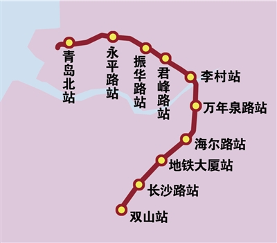地鐵3號線全長約25公里,包括22個車站,1個控制中心、1個車輛段,于2010年下半年開工建設。位于3號線中間位置的錯埠嶺站和南端的青島站因前期征遷等問題工期延后,影響了全線開通計劃。地鐵3號線計劃先開通北段,自北向南包括青島北站、永平路站、振華路站、君峰路站、李村站、萬年泉路站、海爾路站、地鐵大廈站、長沙路站、雙山站等10個車站,總里程約12公里。南段計劃2016年底接入,實現(xiàn)全線開通試運營。
