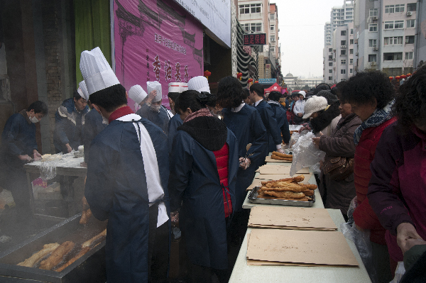 香油果子(油條)是文化山會(huì)代表性的小吃,購買者排起了長長的隊(duì)伍。