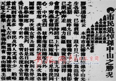 ????青島籌備和追悼孫中山大會舉行期間,一些單位和個人紛紛撰寫哀悼孫中山的挽聯(lián)。《中國青島報》在七版副刊“消閑錄”上予以選擇刊登,并連載刊發(fā)唐堯欽撰寫的《哀孫中山先生文》。