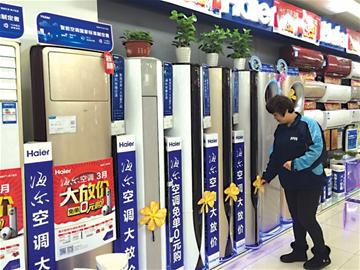 ????剛走進(jìn)位于南京路的國美電器家電賣場,就立刻能感受到空調(diào)大戰(zhàn)濃濃的火藥味。美的、海爾、海信三大品牌將各自的巨幅促銷廣告貼在商場的地板上,指引著消費者前往核心區(qū)域——空調(diào)銷售專區(qū)。 “美的空調(diào)火三月,史上最低價,全年最低價”這樣煽動性的字眼讓消費者不得不前往探個究竟??照{(diào)巨頭海爾也不甘示弱,打出了“海爾空調(diào)3月大放假,免單0元購”的標(biāo)語吸引消費者。另外一大家電巨頭海信的口號則是“三月變頻風(fēng)暴”,旗下一款1.2P海信變頻空調(diào)價格低至1990元。“隨著天氣的逐漸轉(zhuǎn)暖,今年空調(diào)的促銷已經(jīng)提前啟動。 ”蘇寧云商青島分公司總經(jīng)理助理董桂峰告訴記者。除了宣傳攻勢最猛烈的這三大品牌之外,格力、惠而浦、奧克斯、長虹、TCL等多個品牌也都加入降價行列。