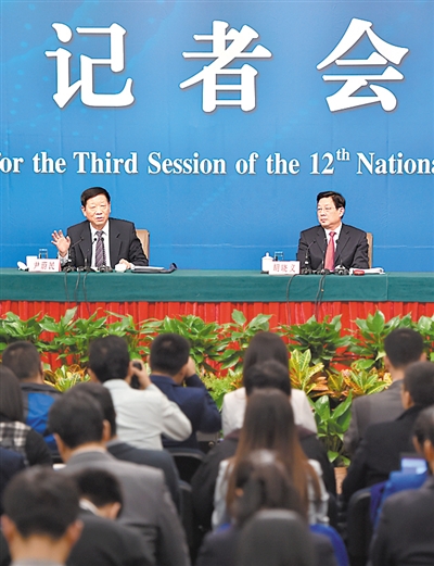 3月10日,十二屆全國人大三次會議新聞中心舉行記者會,邀請人力資源和社會保障部部長尹蔚民、副部長胡曉義對“就業(yè)和社會保障”的相關(guān)問題回答中外記者提問。 新華社照片