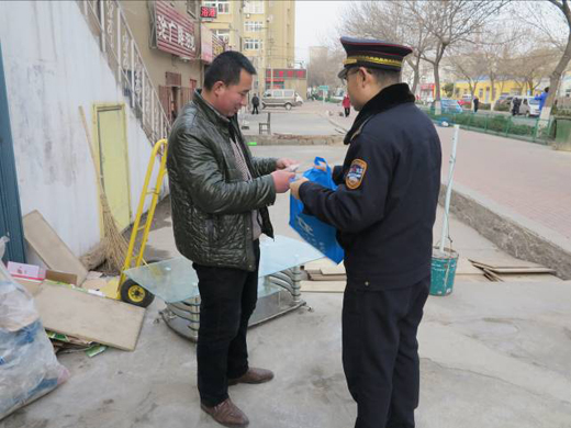 城管北客站中隊首先深入業(yè)戶一線,以宣傳教育為主,搭建良性溝通平臺,外延執(zhí)法人員對滄廣路和滄臺支路的沿街商戶發(fā)放城管便民手冊,宣傳城管執(zhí)法。針對部分沿街商戶沒有達到齊門經(jīng)營的標(biāo)準(zhǔn),存在廣告燈箱亂放、占道經(jīng)營、店外經(jīng)營、亂擺亂放等影響市容市貌的行為,采取宣傳發(fā)動為主,為商戶講解齊門經(jīng)營相關(guān)法規(guī)要求,幫助業(yè)戶改正違章違法行為。