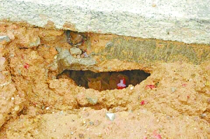 ????記者發(fā)現(xiàn),在距古墓中心位置約5米處的一個(gè)石階下面,有一個(gè)近一米長(zhǎng)、60公分寬的洞口,從洞口穿入墓地,在洞口旁邊堆放著兩堆大約兩斗車(chē)有3個(gè)立方米的泥土,李文遷告訴記者,這段時(shí)間不斷有后人前來(lái)拜祭,但昨天古墓才發(fā)現(xiàn)被盜,因此,估計(jì)古墓是在最近幾天被盜的。