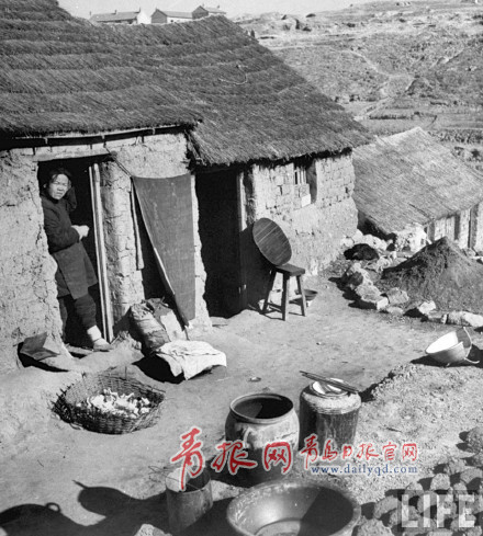 美國人鏡頭下1948年青島:農村婦女破敗房子