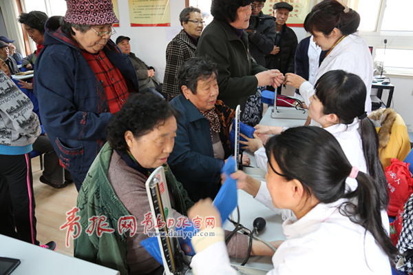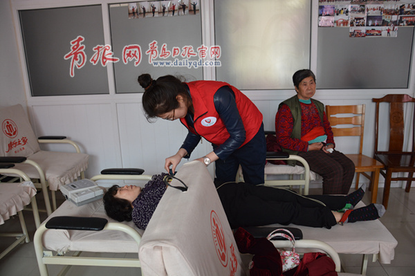 ??????????????????????????????? ■嶗山紅馬甲志愿者為老人們現(xiàn)場(chǎng)做心電圖。