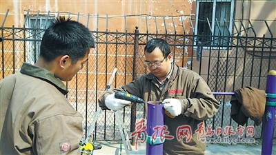 ????記者10日在市北陵縣路社區(qū)健身廣場上看到,當(dāng)天上午9點半,五六名專業(yè)維修團隊工作人員拿著鉆頭、螺絲帽以及健身器材部件,正在對前期摸底排查出的問題器材逐一進行維修。工作人員介紹,維修團隊共有兩個小分隊,每個小分隊都有10名工作人員,從今年2月份開始,他們兵分兩路,每天開著工程車對市北區(qū)19個街道567處健身廣場進行逐一巡檢,檢查健身器材及零配件是否松動、有無異音或開焊生銹等問題,同時對活動部位進行潤滑、防銹保養(yǎng)?!拔覀儼寻l(fā)現(xiàn)的每一個問題逐一記錄到維修記錄本里,24小時內(nèi)安排人員進行維修,48小時內(nèi)必須維修完畢。如果社區(qū)居民發(fā)現(xiàn)小區(qū)健身設(shè)備有問題,撥打我們的維修電話82523289后我們也將在2個小時內(nèi)趕到現(xiàn)場進行勘查?!本S修人員介紹說。