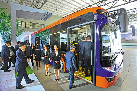 嘉賓們體驗18米超級電容儲能式現(xiàn)代電車。(記者 徐能攝)