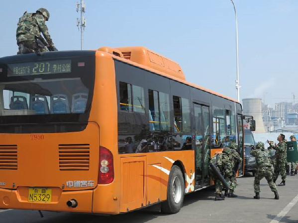 上午九點,參加演練單位、人員已各就其位。九點三十分,演練正式開始,首先由邊防李滄大隊郭隊長向現(xiàn)場人員就應急突發(fā)事件預防以及基本處置的進行培訓。培訓中,郭隊長向大家展示了基本的防身技能和處置手法。隨后在公交車上進行歹徒挾持駕駛員,特警人員快速反應解救人質(zhì)的防恐反恐演練。行動全程環(huán)環(huán)相扣節(jié)奏緊湊,短短幾分鐘特警已將歹徒制服,成功解救人質(zhì)。最后在參演人員密切配合下,快速撲滅火苗,完成了消防演練。