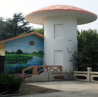 ??? 該處房屋原為秀水河橋頭閑置房屋,為與周邊同和路、秀水河及市政府招待所的環(huán)境形象相呼應(yīng),在南側(cè)平房屋山上繪制藍(lán)天、白云、河流、綠地,其旁側(cè)的立柱粉刷成蘑菇造型,打造成橋頭小品,成為周圍綠色環(huán)境中的一亮點(diǎn)點(diǎn)綴。