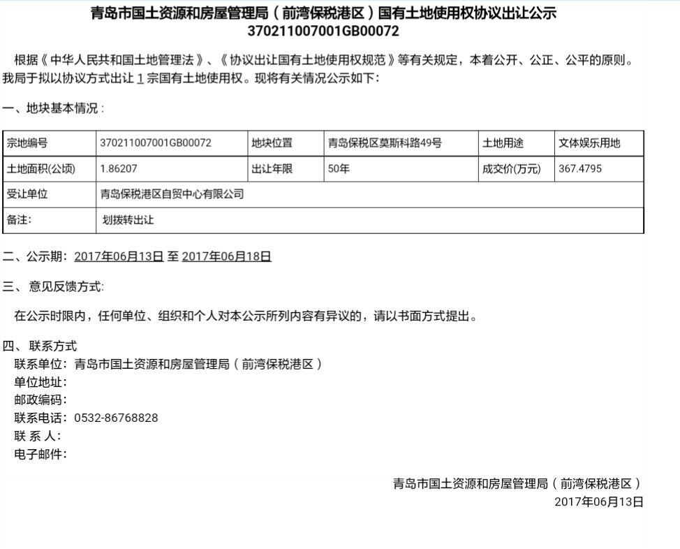 青島市國土資源和房屋管理局(前灣保稅港區(qū))國有土地使用權(quán)協(xié)議出讓公示—370211007001GB00072