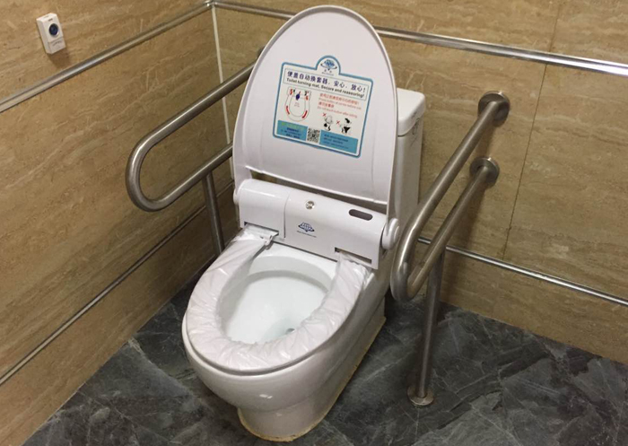 公廁內(nèi)坐便器加裝自動(dòng)換套馬桶蓋,通過觸摸按鈕控制,自動(dòng)更換座圈上的一次性薄膜紙,確保一客一更換,為市民提供放心干凈的如廁環(huán)境。