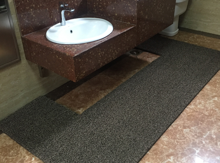 公廁地面更換PVC絲圈地墊,該地墊具有防滑、防水、防滲、阻燃、易清洗的特點(diǎn),可避免洗手臺(tái)周邊地面濕滑,保持地面干燥潔凈。