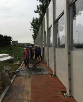 ?  區(qū)建管局從實(shí)際出發(fā),該小區(qū)不僅距離環(huán)灣路較近(140米),同時(shí)更靠近膠濟(jì)鐵路線(38米),依據(jù)環(huán)評(píng)檢測(cè)報(bào)告及越秀小區(qū)樓層較高的現(xiàn)狀,完成環(huán)灣路東側(cè)人行道隔音屏的方案設(shè)計(jì),在環(huán)灣路設(shè)置長(zhǎng)度約600米,高度5米的道路隔音屏;同步委托中鐵濟(jì)南院進(jìn)行鐵路專用隔音屏方案設(shè)計(jì),在鐵路東側(cè)設(shè)置金屬插板式隔音屏,長(zhǎng)度約600米,高度3.5米,隔音屏中心距線路中心5.7米。在確定實(shí)施方案后,對(duì)隔音屏施工方案進(jìn)行公示、答疑工作,得到了居民的一致好評(píng)。目前,已完成基礎(chǔ)及立柱安裝,正在進(jìn)行面板施工,預(yù)計(jì)10月初全部完工。