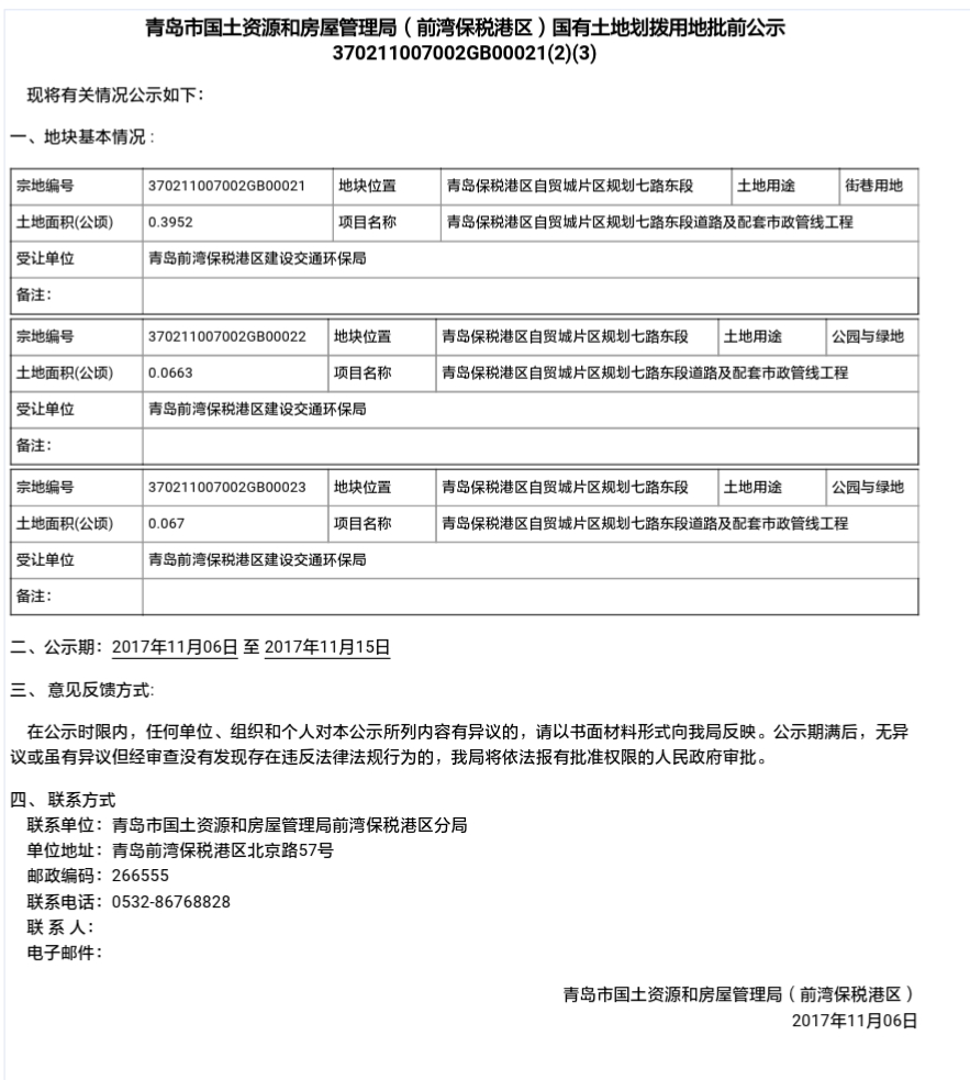 青島市國土資源和房屋管理局(前灣保稅港區(qū))國有土地劃撥用地批前公示