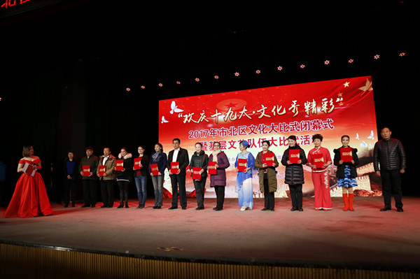 青報(bào)網(wǎng)訊? 為慶祝黨的十九大勝利召開,推動(dòng)青島市民文化藝術(shù)節(jié)深入開展,促進(jìn)優(yōu)秀文藝作品的傳播和推廣,提升基層文藝隊(duì)伍水平,豐富活躍群眾文化生活,市北區(qū)文新局主辦、第一、第二文化館、各街道辦事處文化站承辦的2017年文化大比武活動(dòng)圓滿落下帷幕。2017年市北區(qū)文化大比武閉幕式暨基層文藝隊(duì)伍大比武活動(dòng)在市北劇場(chǎng)隆重舉行。
