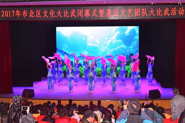 2017年市北文化大比武活動(dòng)共有五大板塊,200余項(xiàng)活動(dòng)。今年市北區(qū)文化大比武閉幕式采取基層文藝隊(duì)伍輔導(dǎo)成果展演同臺(tái)競(jìng)技的舉辦方式。來自全區(qū)19個(gè)街道選送的優(yōu)秀文藝隊(duì)伍,在經(jīng)過近2個(gè)月的輔導(dǎo)培訓(xùn)基礎(chǔ)上,將新編排的文藝節(jié)目同臺(tái)競(jìng)技。