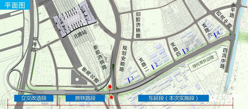 太原路東延段工程主線全長(zhǎng)約1.2公里,標(biāo)準(zhǔn)段規(guī)劃紅線44.5米,雙向八車道??傮w設(shè)計(jì)方案為主線高架西接已建跨新膠濟(jì)鐵路線橋梁,向東跨越規(guī)劃安順路后落地,與四流中路、永平路平交。該項(xiàng)目投入使用后,環(huán)灣路進(jìn)出火車北站車輛可通過(guò)太原路立交上下行匝道橋進(jìn)出北站西廣場(chǎng),將實(shí)現(xiàn)環(huán)灣路與北站西廣場(chǎng)的交通銜接,有效提升北站及周邊對(duì)外交通疏解條件。