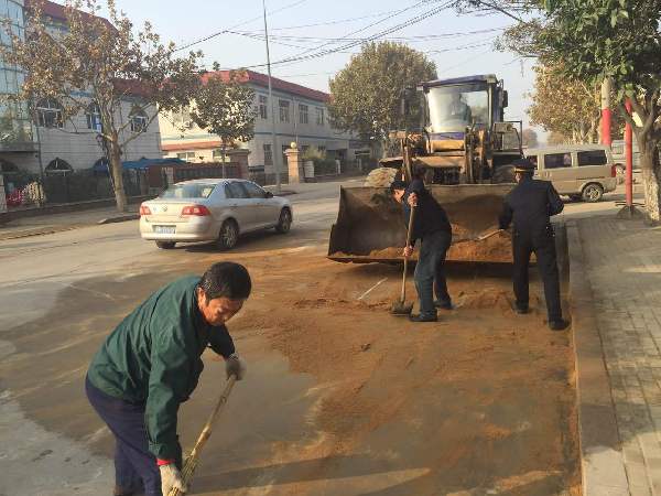 執(zhí)法人員立即設(shè)置安全警示標(biāo)志,組織轄區(qū)內(nèi)單位的鏟車(chē)以及工人及時(shí)趕赴現(xiàn)場(chǎng)共同清理黃沙撒漏。20分鐘后,在執(zhí)法人員和工人共同努力下,該處撒漏路段清理完畢,恢復(fù)了路面的潔凈,保證了交通的暢通。由于處置及時(shí)得當(dāng),并未造成安全事故。