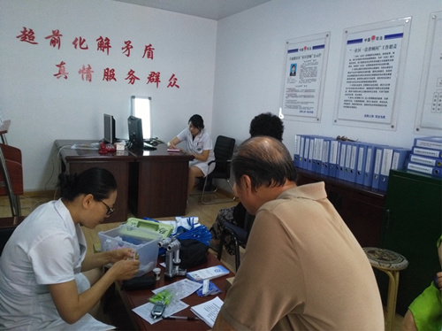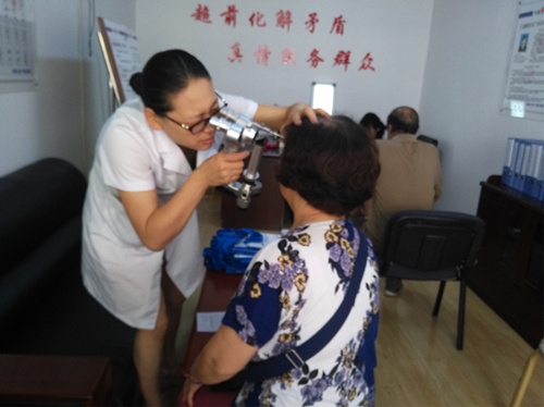 醫(yī)療服務隊對前來的每一名居民都進行了視力的測量,針對老年人容易出現(xiàn)的眼科疾病,如白內障、青光眼等進行檢查。檢查過后還有專門的人員對老人的檢查結果進行耐心解釋,針對需要治療的過程進行簡單說明,向需要動白內障手術的居民講解免費做手術的申請條件。