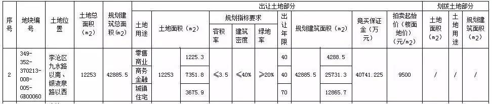 地塊二于12月30日上午拍賣,最終被青島融寶置業(yè)有限公司及融實(shí)(香港)有限公司聯(lián)合競(jìng)得,樓面地價(jià)9500元/㎡,成交金額40741.225萬(wàn)元。土地用途包含零售商業(yè)、商務(wù)金融及城鎮(zhèn)住宅用地,占地面積為12253㎡,容積率小于等于3.5,規(guī)劃地上建筑面積42885.5㎡。