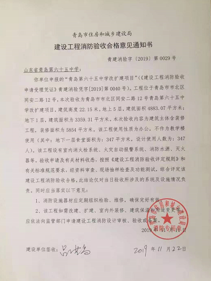 65中學(xué)改擴建項目位于65中學(xué)西南側(cè),總建筑面積約8300平方米,建設(shè)內(nèi)容為新建一棟30班教學(xué)綜合樓以及地下車庫和餐廳等,總投資約6000萬元。項目自2018年7月開工以來,城建局堅持“攻山頭、炸碉堡”的戰(zhàn)斗姿態(tài),克服工期緊、要求高、地質(zhì)條件復(fù)雜等困難,盯緊安全、質(zhì)量、進(jìn)度各個環(huán)節(jié),組織各參建單位優(yōu)化工期、科學(xué)施工、注重安全、壓茬推進(jìn),近期,該項目通過市住房和城鄉(xiāng)建設(shè)局的消防驗收,順利取得建設(shè)工程消防驗收合格意見書。項目投入使用后可為65中學(xué)新增1000余個學(xué)位,將進(jìn)一步改善教育教學(xué)環(huán)境,發(fā)揮優(yōu)質(zhì)教育資源能效,緩解浮山后片區(qū)初中學(xué)位不足的問題。
