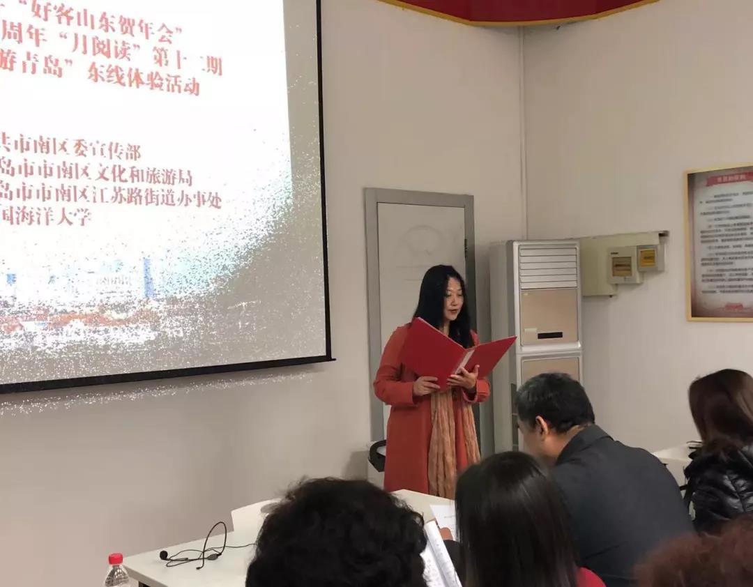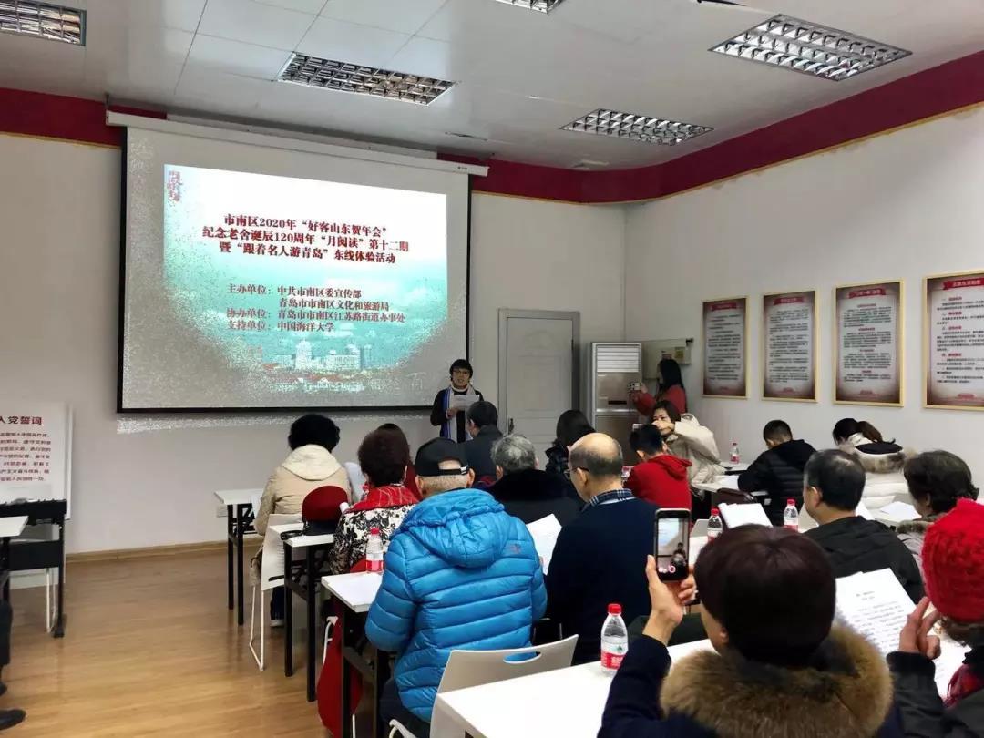 青報(bào)網(wǎng)訊? 2019年12月28日,在青島市市南區(qū)江蘇路街道黃縣路上的“青鋒匯黨群服務(wù)空間”教室里,中國海洋大學(xué)校史研究室主任、島城文史專家楊洪勛教授向來自大學(xué)、社區(qū)的學(xué)生和居民,講解了老青島的歷史和變遷,以及老舍先生和居住在青島工作生活的文化名人的狀況,3名朗讀愛好者朗讀了老舍先生的經(jīng)典作品篇目,拉開了市南區(qū)“2020年好客山東賀年會(huì)”、紀(jì)念老舍誕辰120周年“月閱讀”第十二期、“跟著名人游青島”活動(dòng)的冬季賞游之旅的序幕。圍繞文化和旅游融合發(fā)展的新時(shí)代要求,市南區(qū)文化和旅游局精心策劃、重磅打造文旅融合新品牌 “探尋青島文旅坐標(biāo)”活動(dòng),推出“名人”、“名景”、“名?!?、“名吃”、“網(wǎng)紅”五大游線,燃爆市南區(qū)冬季和新春文旅游程。