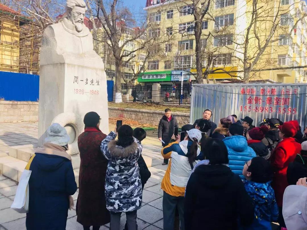 在海大的聞一多、趙太侔、楊振聲等文化名人雕像前,大家一起感受了文化名人的風(fēng)姿,傾聽了他們的故事。