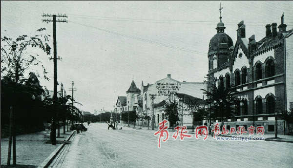 ????弗雷德里希大街 德占時期,華洋有別,城分內(nèi)外。當(dāng)時的城市規(guī)劃中,以今德縣路、保定路一線為界,以南為歐人區(qū),以北為華人商住區(qū)。今中山路南段被命名為弗里德里希大街,北段則稱為山東街。圖為弗里德里希大街南段街景,東側(cè)近景建筑為膠州旅館,遠(yuǎn)景建筑為水師飯店。