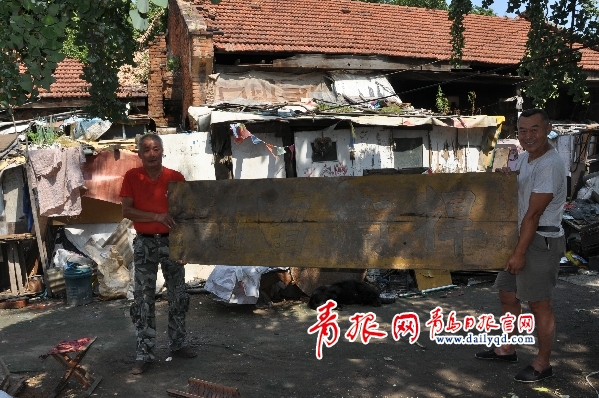 ????“紀(jì)念堂的大門共有四扇,兩扇還在。紀(jì)念堂的重要物件——木質(zhì)牌匾我至今保留著。當(dāng)年紅衛(wèi)兵破壞舊警察公墓時,我父親奮力保護(hù),這塊牌匾才免遭毀壞?!痹谟浾咭笙?,矯杭本打開靈堂門鎖,將室內(nèi)雜亂堆積的物品移開后,吃力地搬出了牌匾?,F(xiàn)場估量,這塊牌匾長2米有余,寬1米多,正面刻著“捍衛(wèi)留績”四個大字,邊側(cè)刻有“中華民國二十年十月”,落款是“胡若愚 題”。