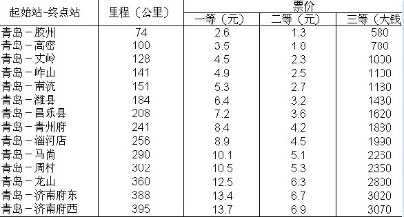 膠濟(jì)鐵路青島站至部分車站客運(yùn)票價(jià)