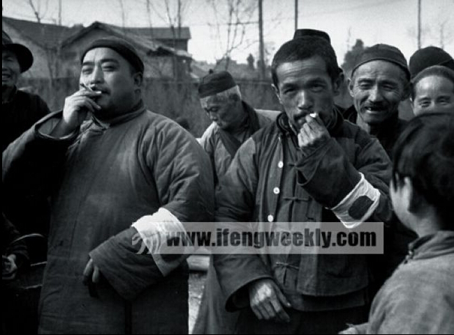 ????通款敵國,謀叛本國,為侵略自己祖國的敵人的利益服務,并謀取一己的私利,這樣的人物在世界各國的對外戰(zhàn)爭中均為常見,中國亦不例外。漢奸一詞就是國人對他們的鄙稱??谷諔?zhàn)場上,為日寇作戰(zhàn)的偽軍超過百萬之眾,人數(shù)之多,猶如過江之鯽。而更多的下層漢奸是社會上的無業(yè)游民,如流氓、無賴、兵痞、土匪、失意軍人等。(來源:鳳凰周刊)圖中兩個手臂上帶著“太陽旗”袖標的中國人愜意地抽著香煙,而周圍的圍觀者則投以羨慕的眼神。