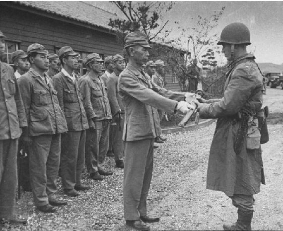 1945年8月15日,日本宣布投降 720萬(wàn)日軍放下武器投降。圖為日軍軍官向中國(guó)軍官呈獻(xiàn)軍刀。