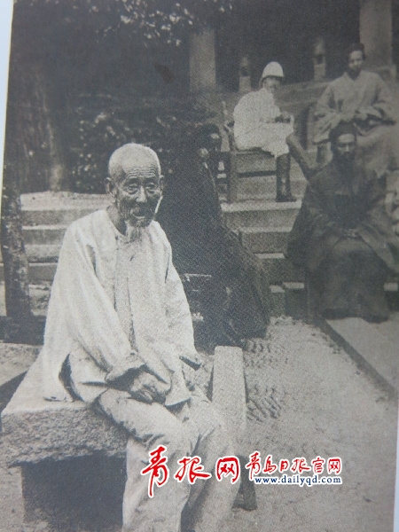 道觀前的坐立的青島老漢,遠處是德國軍官和道士
