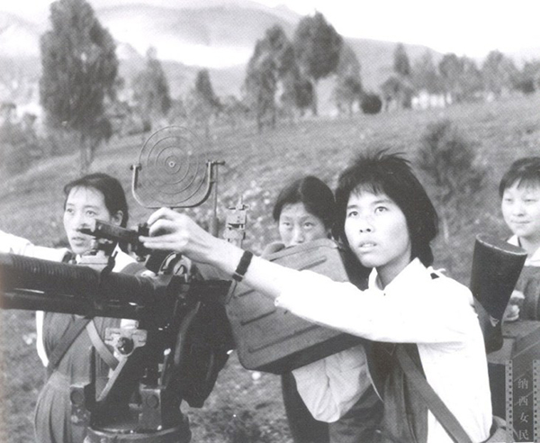在麗江獅子山訓(xùn)練用高射機(jī)槍打飛機(jī)的納西女民兵。