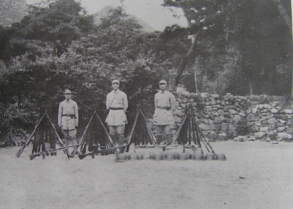 大嶗戰(zhàn)役后高芳先(中)與第三大隊長董修璋(左)、特務(wù)大隊張許京武(右)及繳獲戰(zhàn)利品合影